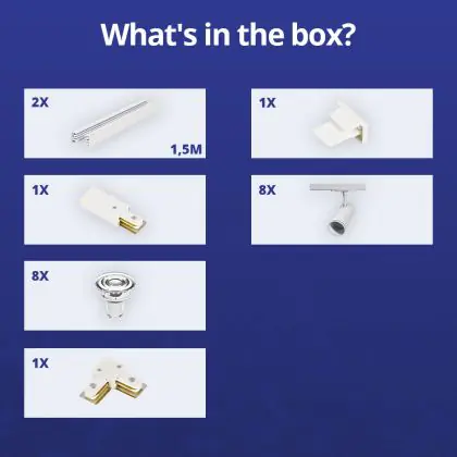 | Manufacturer Name | Complete L shaped 1-Phase Track Set White incl. 8x Spot fixture + GU10 2700K 3W Dim – 1,5 x 1,5 mete | |