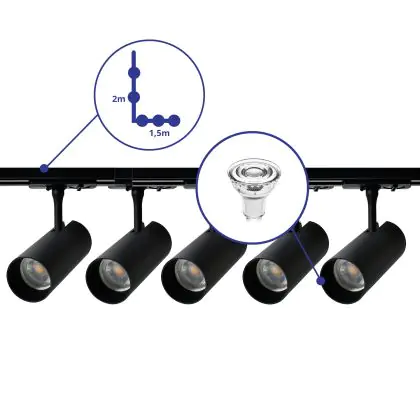 Complete Set 1-Phase Rail L 1,5 x 2 Meter Black | incl. 5x Spot + GU10 2700K 3W Dimmable + End Cap, Power Connector and L -Connector