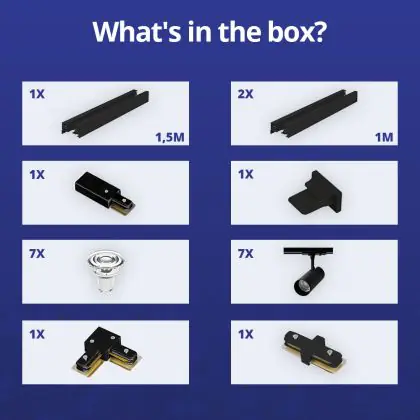 | Manufacturer Name | Complete L shaped 1-Phase Track Set Black incl. 7x Spot fixture + GU10 2700K 3W Dim – 1,5 x 2 meter | |