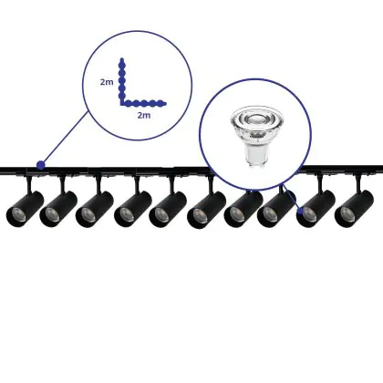 Complete Set 1-Phase Rail L 2 x 2 Meter Black | incl. 10x Spot + GU10 2700K 3W Dimmable + End Cap, Power Connector and L -Connector