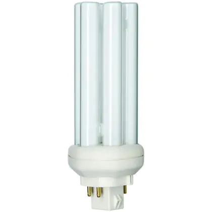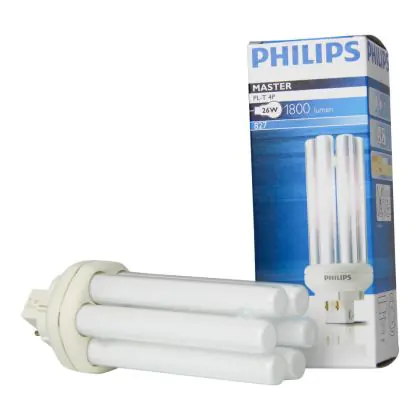 The Philips PL-T 4P lamps are 4 pin sockets lamps and are made of 6 tubes. They are compact fluorescent lamps with separate power supplies. They are very energy efficient and must be used with a ferromagnetic ballast. Philips PL-T 26W 827 4P have a GX24q-3 socket type and measure 590 cm.